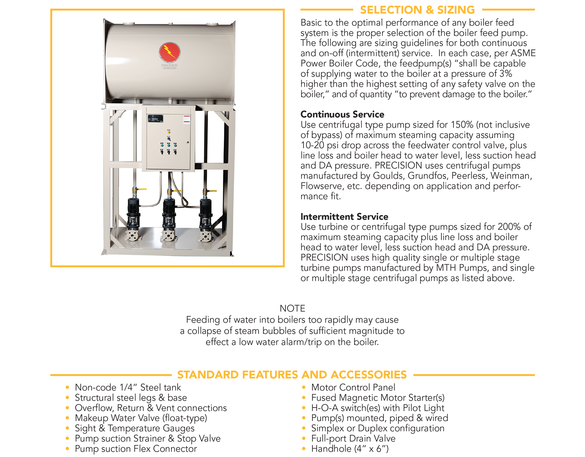 Precision Boilers Surge Tanks provide additional condensate storage to balance rapid load changes in steam systems. Available in various sizes and configurations, they prevent overflow and pump short-cycling by temporarily holding excess condensate. When paired with correctly sized feed pumps, surge tanks enhance system stability, protect equipment, and improve overall boiler feed performance.