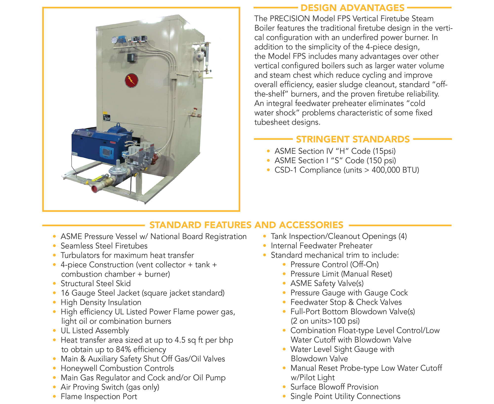 The FPS is a rugged, packaged vertical steam boiler built around a proven vertical fire tube boiler design for reliable performance in demanding commercial and industrial environments. This vertical fire tube boiler configuration supports efficient heat transfer and service-friendly maintenance, with a durable cabinet and structural base designed for long life. As a compact vertical boiler, the FPS is well-suited for facilities that need dependable steam in a small footprint, and it can be specified with a range of standard trim and optional accessories to match site requirements. Many customers choose this vertical boiler for straightforward installation, consistent operation, and a flexible set of factory-installed options.