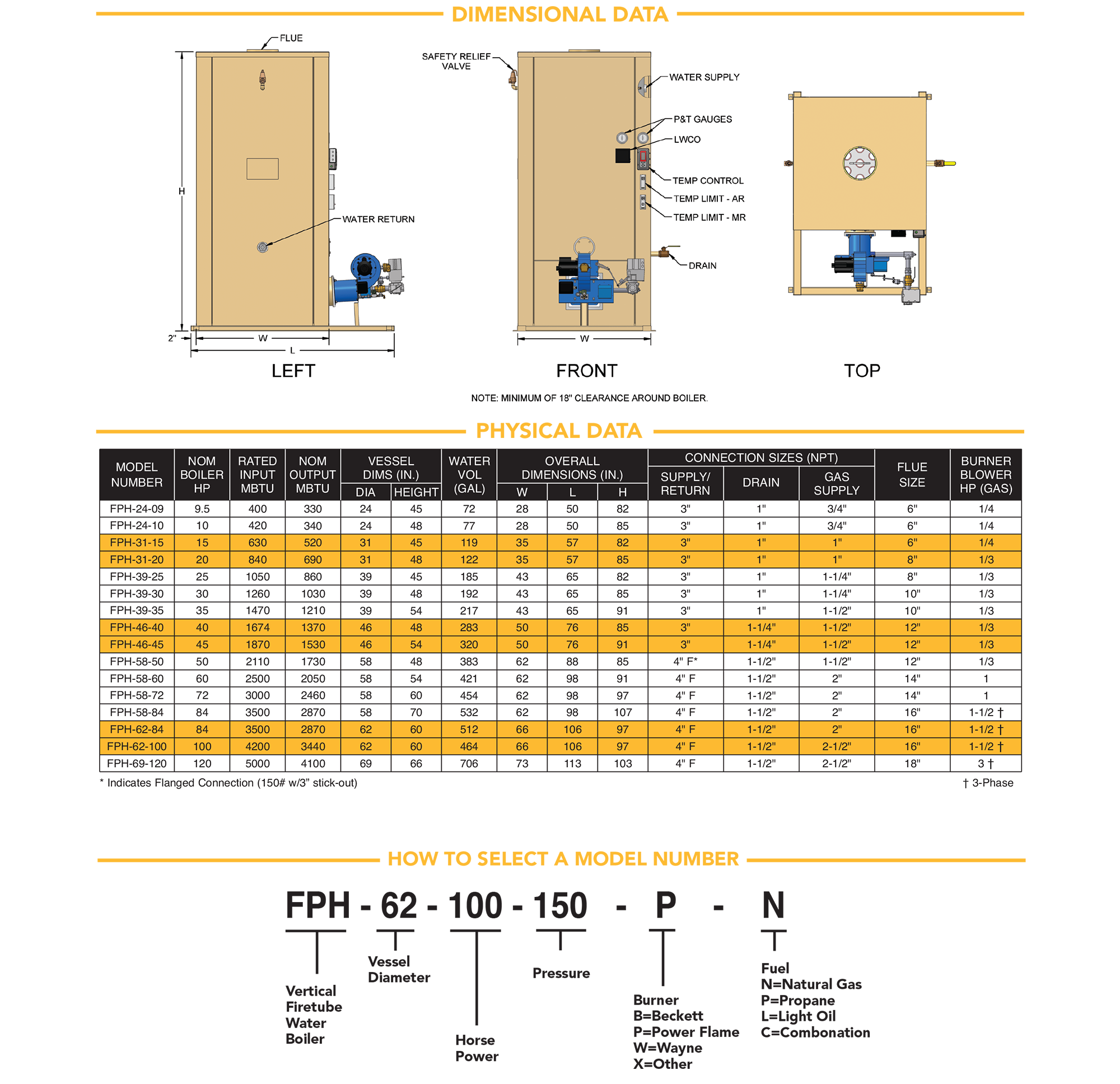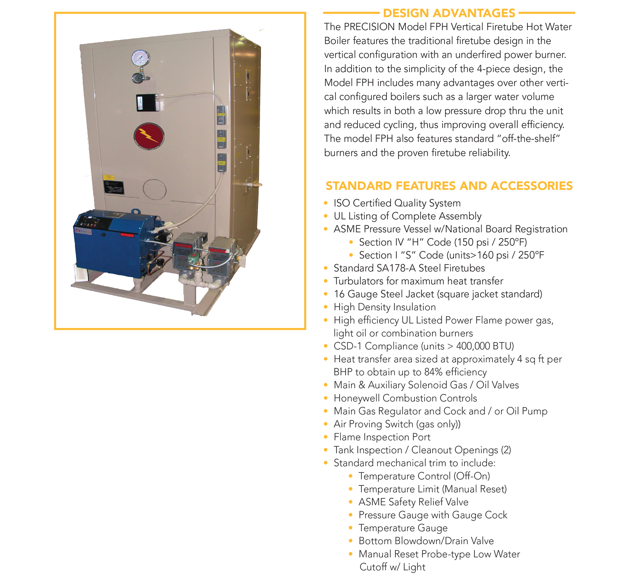 The FPH Vertical Firetube Hot Water Boiler combines traditional firetube design with a vertical configuration and underfired power burner, offering a simple 4-piece design with several advantages. Its larger water volume enhances efficiency by reducing pressure drop and cycling, while standard “off-the-shelf” burners ensure reliable performance. Built on a proven, durable firetube design, it delivers dependable and long-lasting operation.